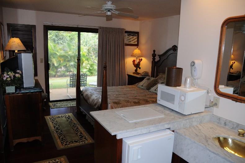 This is a nice and simple hotel for a bargain price. (A rare thing on Kauai.) A few dog "mascots" lounge by the front desk.